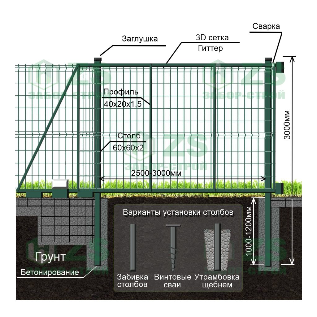 Конструкция забора из 3Д панелей с бетонирование столбов: