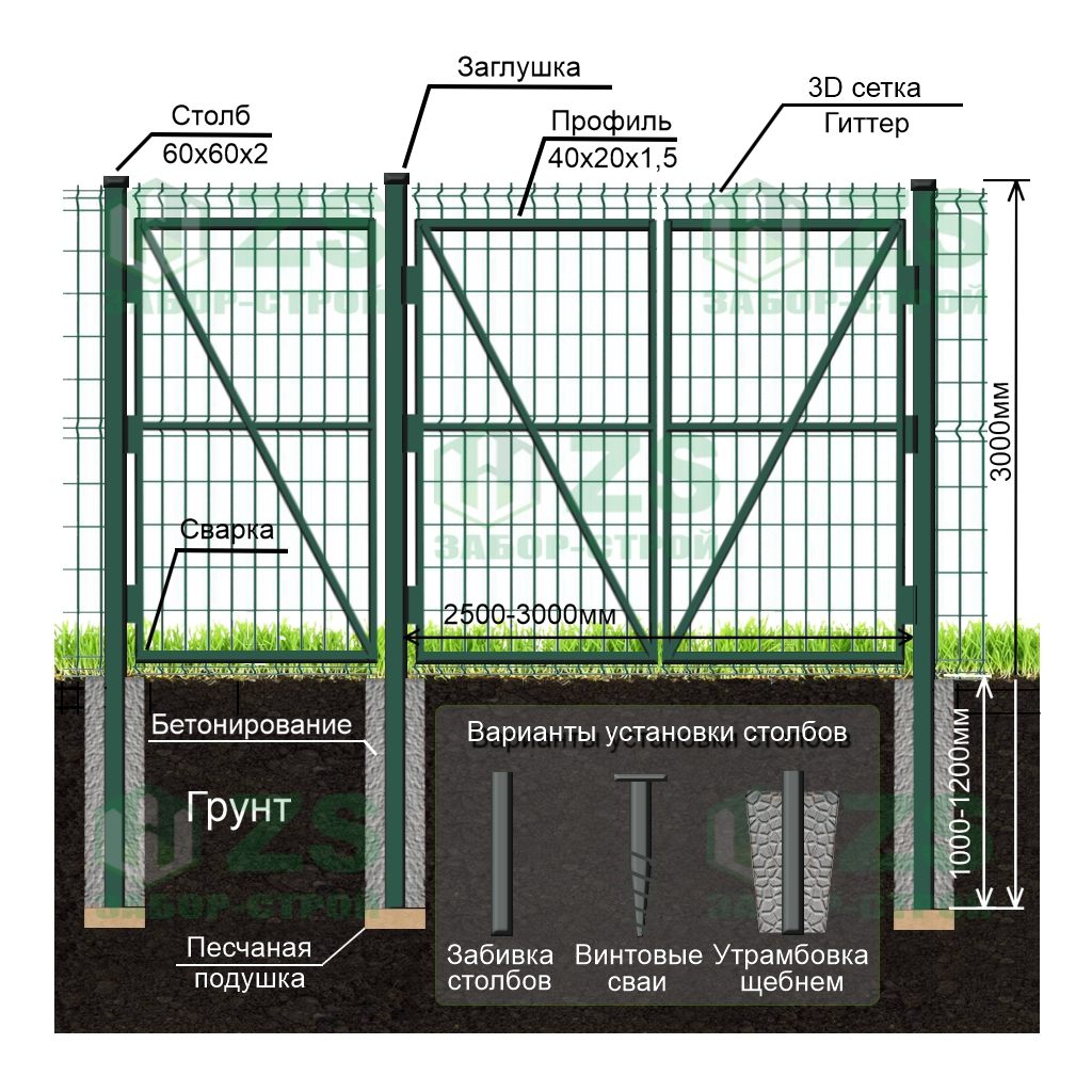 Конструкция распашных ворот с калиткой из 3Д панелей: